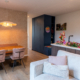Omdat het een huurpand betreft, mocht er niets aan de vloer gedaan worden. En deze zwarte grindvloer maakte de uitdaging des te groter om een warm en rustig welkom te creëren. In de ontvangstruimte moest zich een balie bevinden met een werkplek voor twee tot drie medewerkers. Daarnaast een aparte ruimte als werkplek voor klanten als zij op service moeten wachten. En een open ontvangst waar klanten even kunnen wachten.